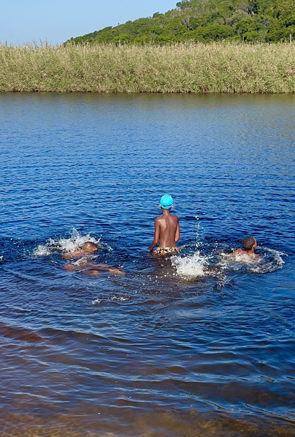 We begonnen bij Victoria Bay, maar de zee was daar zo ruig dat ik er eerlijk gezegd behoorlijk nerveus van werd. Het blijft een verantwoordelijkheid om deze kinderen weer veilig thuis te brengen. Daarom zijn we daarna naar de rivier gegaan, al vonden zij dat toch wat minder spannend. Dus zijn we weer terug naar zee gegaan, naar Leentjiesklip, waar het iets overzichtelijker is. Daar hebben we heerlijk in zee gezwommen. Het water is op dit moment zó fijn dat ik zelf ook veel tijd in het water heb doorgebracht dat gebeurt niet gauw want ik vind het water al gauw veel te koud maar momenteel is de temperatuur top.
