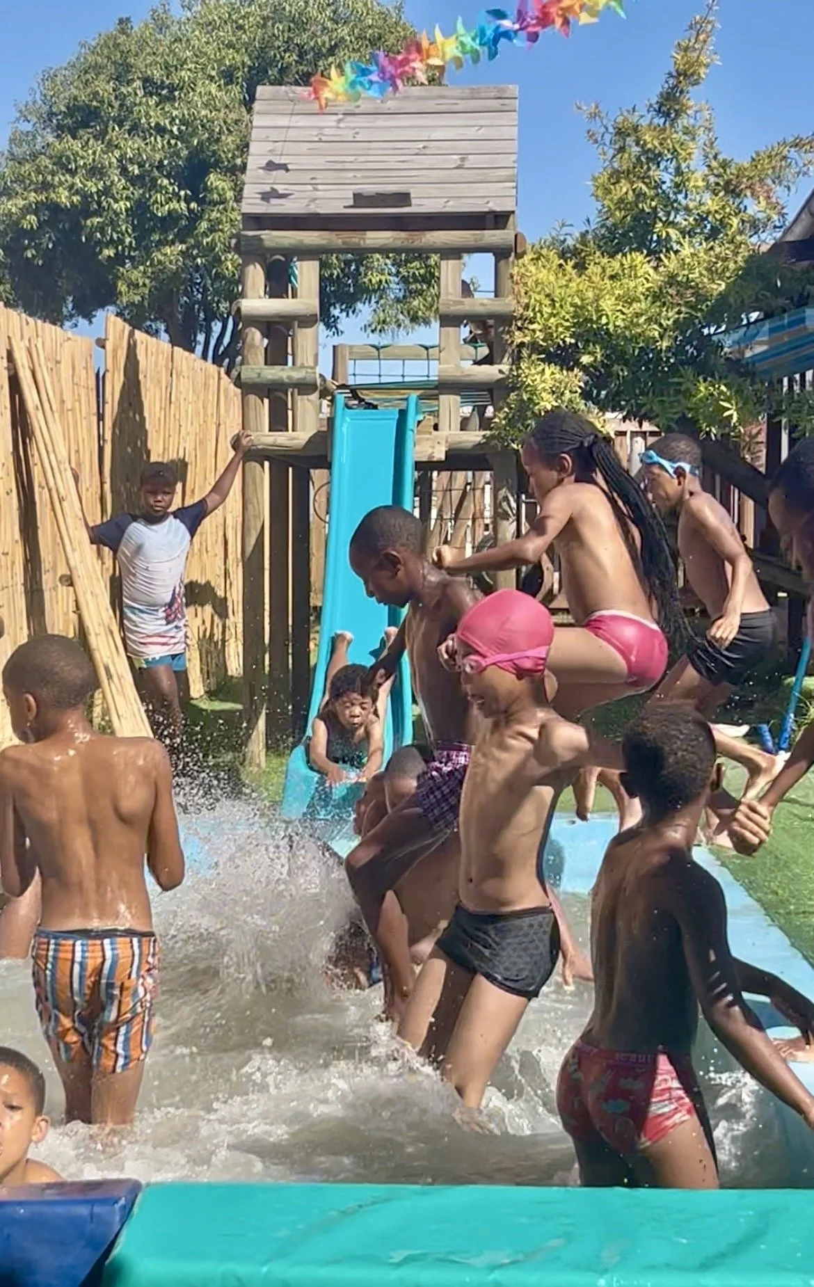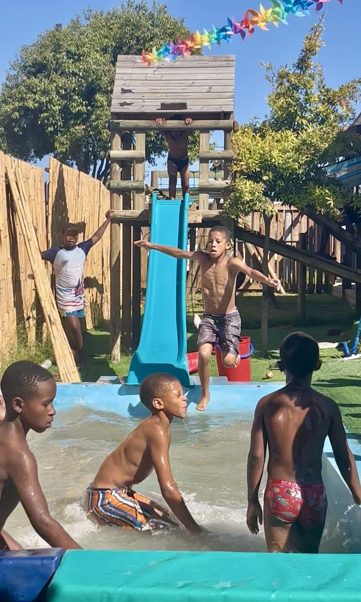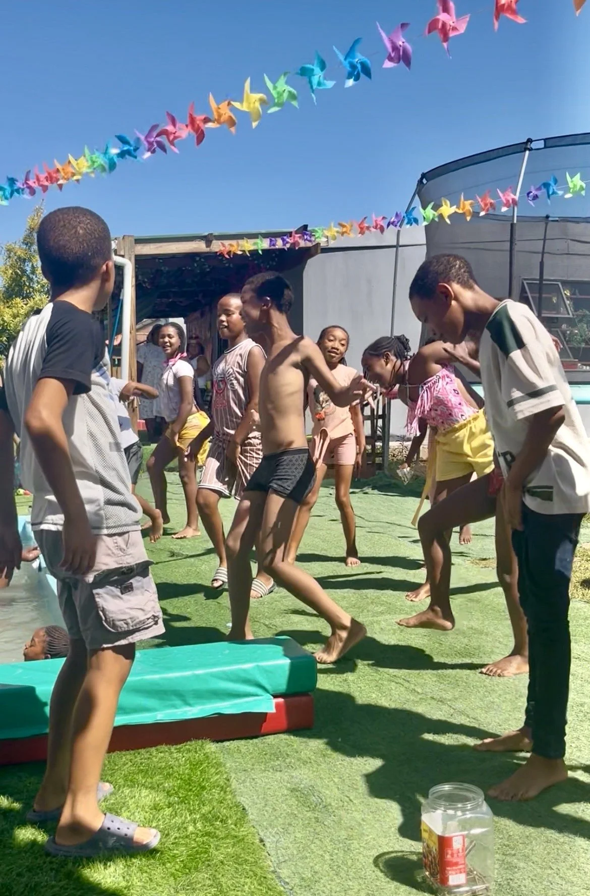 Het zwembad blijft ons zorgenkindje. Ook de laatste verflaag laat weer los, gelukkig minder dan de vorige keer. Later in het seizoen, als het te koud wordt om te zwemmen, gaan we het opnieuw aanpakken en waarschijnlijk betegelen. Tijdens de week dat we gesloten waren was het water groen geworden, maar met regenwater uit de tonnen, een beter afgestelde pomp en filter en wat reinigingsmiddelen lijkt het nu redelijk schoon te blijven. Ik heb een buitendouche en spuit de kinderen af voordat ze het zwembad ingaan dat helpt, al blijft het een uitdaging. De meeste kinderen hebben thuis geen douche, dus hygiëne is een uitdaging. Toch doen we wat we kunnen, en als je ziet hoe ze in dat water duiken en zo ongelooflijk genieten, dan weet ik weer waarvoor ik het doe.